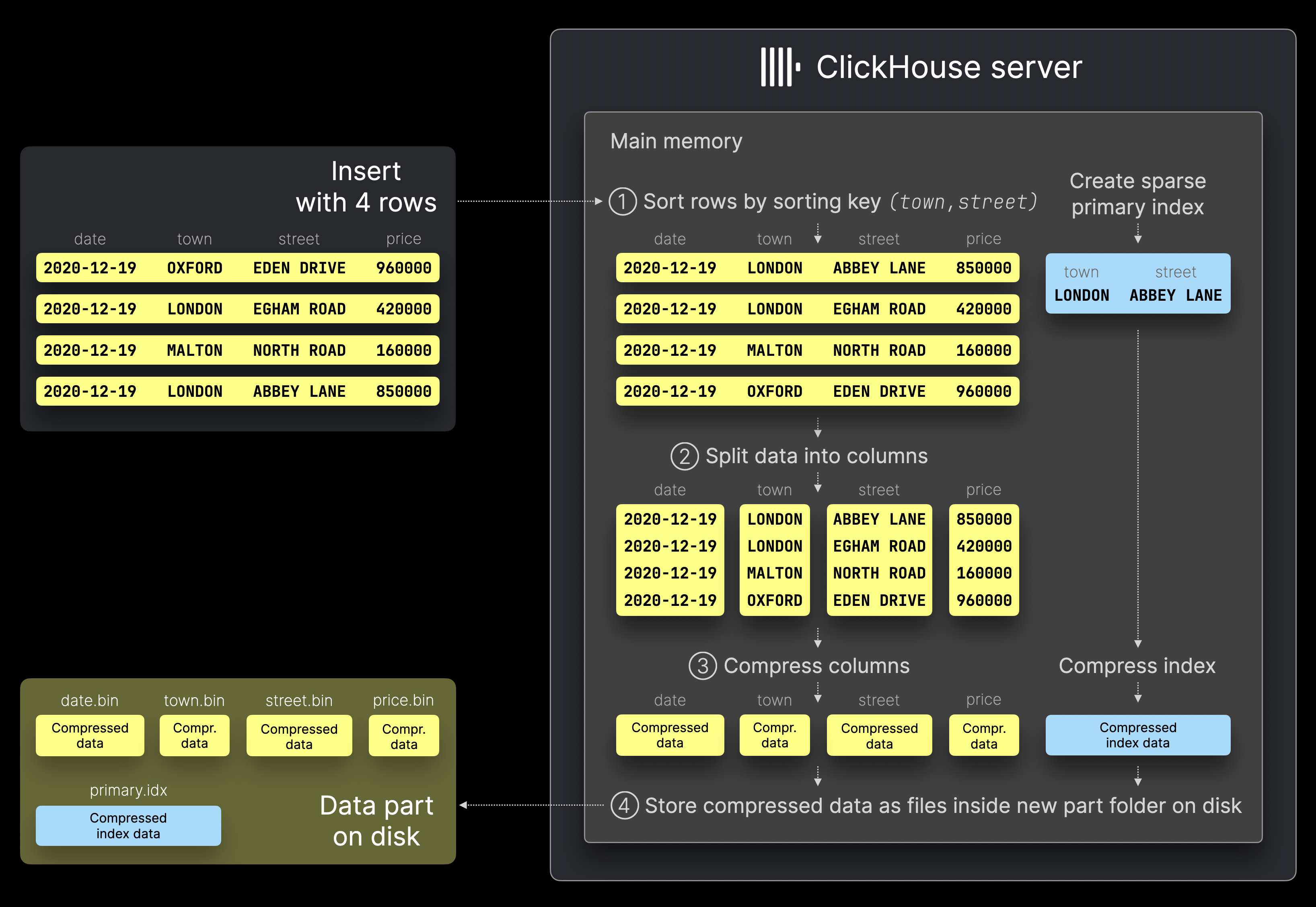 - 写入磁盘,把压缩后的列作为二进制列文件(.bin)保存在新的 data part 目录中,该目录代表本次insert产生的数据部分。同时稀疏索引(.idx)也会被保存在该目录中