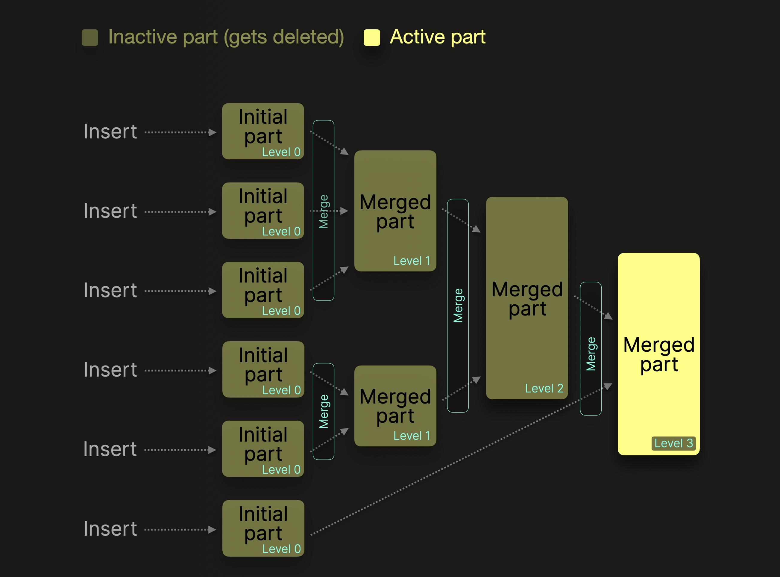 - 查询引擎会拿到当前所有的 active part,无论当前 part 处于哪个层级