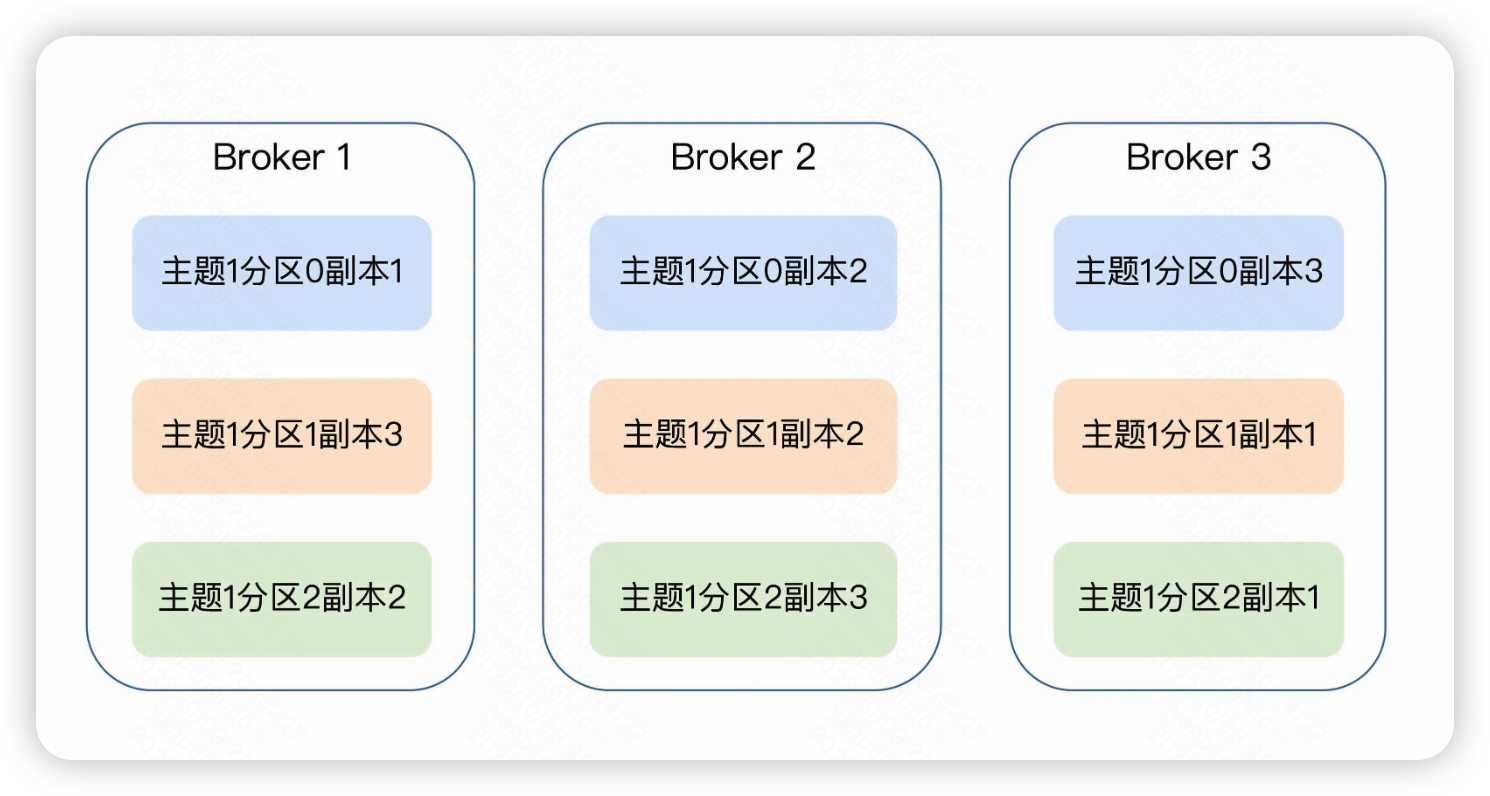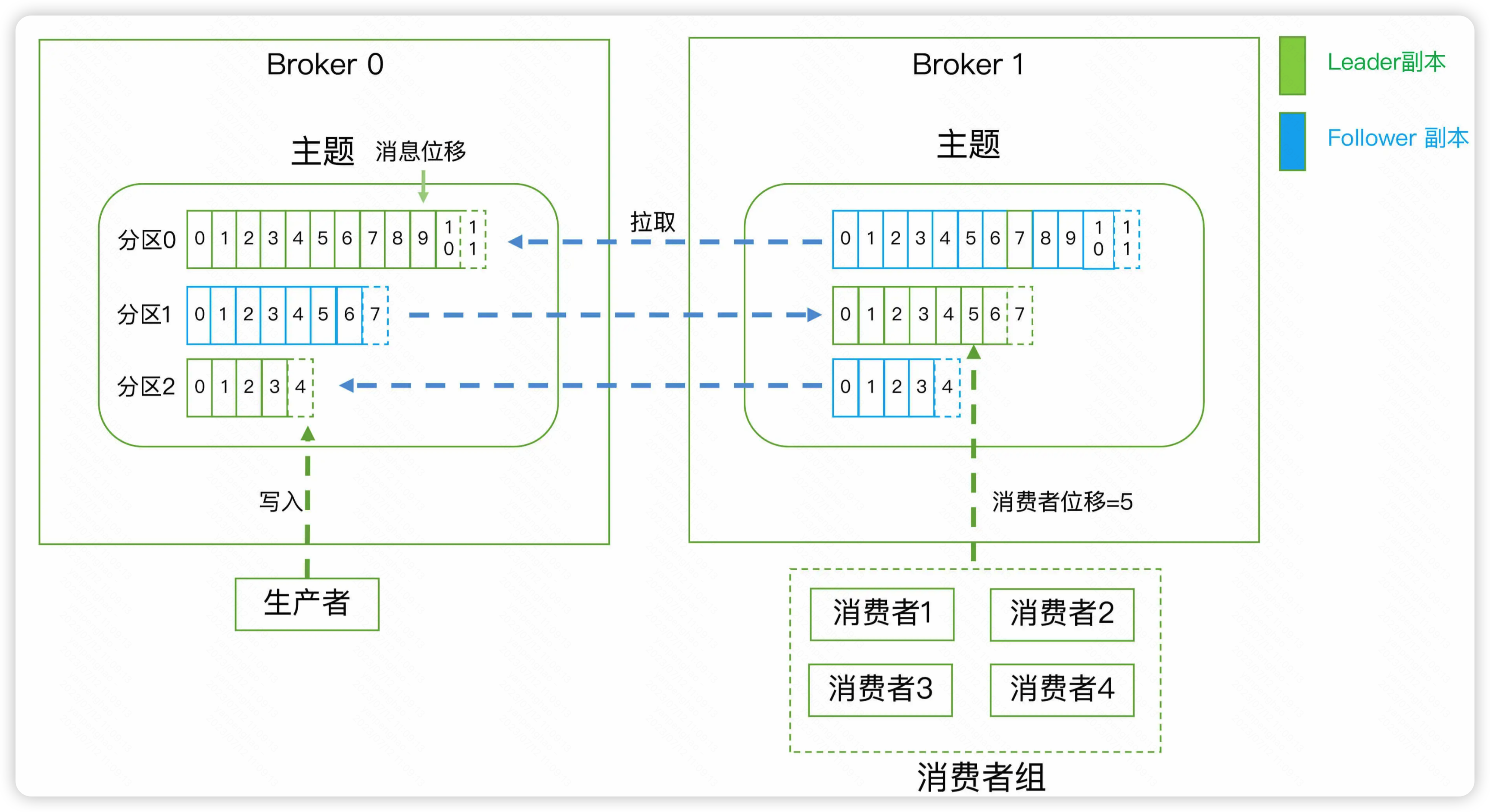 副本是在分区这个级别下定义的,副本的本质就是一个只可以追加写的提交日志。每个分区可以配置n个副本,其中领导者副本只能有1个,其余都是追随者副本。副本分散部署在不同的broker上,每台broker上都可能存在各个主题下不同分区的副本,从而保证某些broker挂掉后Kafka仍然可以对外提供服务。生产者向分区写入消息,每条消息在分区内由一个偏移量(offset)来表示其位置,其中偏移量编号从0开始,一旦消息被成功写入到一个分区上,它的位移值就是固定的了。