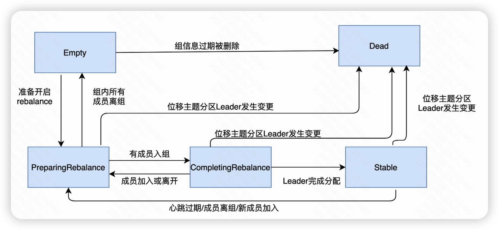 消费者组最开始处于Empty状态,当准备开始重平衡后它会进入PreparingRebalance等待所有消费者实例加入,之后变更到CompletingRebalance状态等待分配方案,最后流转到Stable状态完成重平衡。