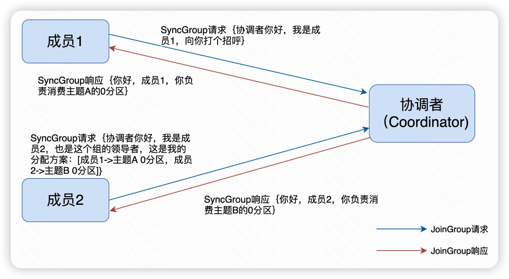 选出领导者后,协调者会把组内消费者的订阅信息以JoinGroup请求响应体的方式发送给领导者,领导者根据这些信息制定出消费计划,接着所有消费者都会给协调者发送SyncGroup请求。不过领导者的请求包含了所有消费者的消费计划,而其他成员的请求中为空,最后协调者把领导者上报的消费信息以SyncGroup响应的方式发送给每个消费者。SyncGroup请求的目的就是让所有成员知道自己的消费信息。