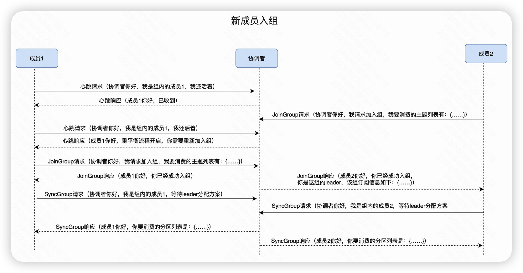 1. 稳定的组中有新消费者加入,协调者收到新的加入请求后,会在心跳反应中通知其余消费者开始rebalance