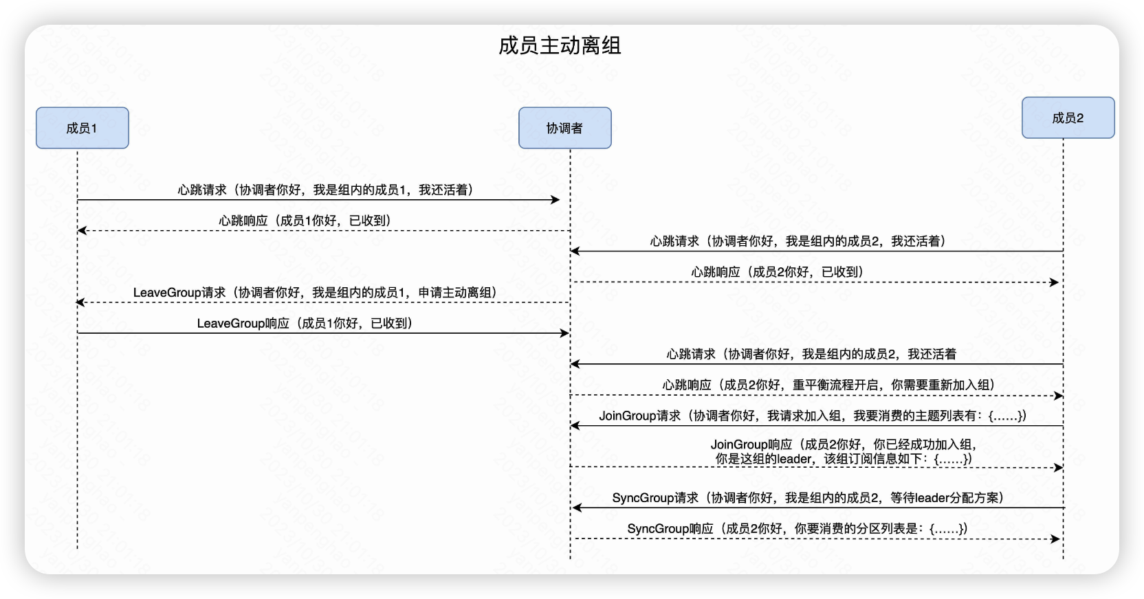 2. 稳定的组中有消费者主动离开,协调者收到LeaveGroup请求后,依然会以心跳响应的方式通知其他成员。
