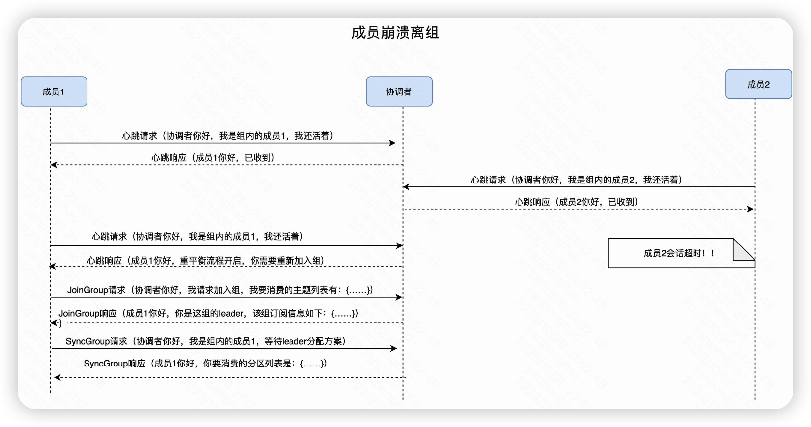 3. 稳定的组中有消费者崩溃离开,崩溃离开是被动行为,在指定心跳时间内没有回应就会通知其余成员。