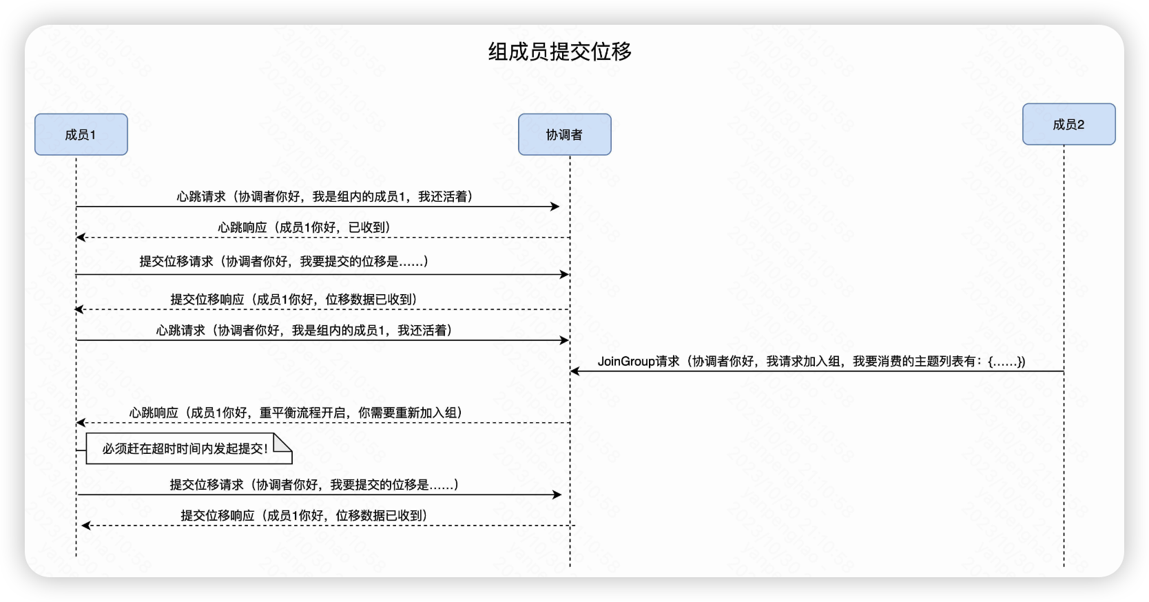 4. 重平衡时协调者会对组内成员提交位移指定一个时间段,每个成员都要在指定时间提交自己的位移情况,然后再开始正常的JoinGroup/SyncGroup请求发送。