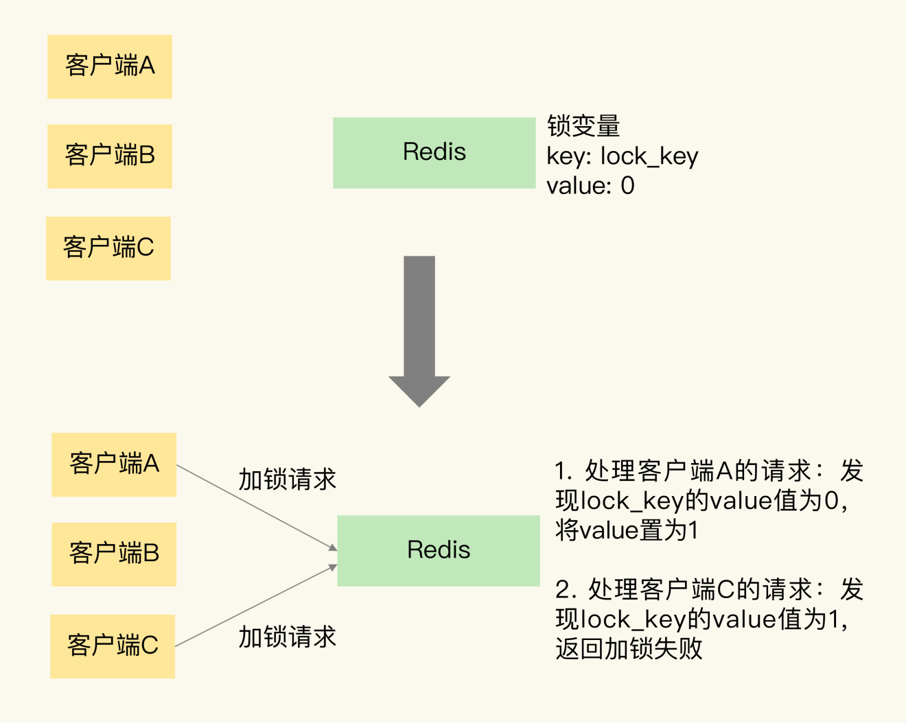 Redis 可以使用键值对来保存锁变量,再接收和处理不同客户端发送的加锁和释放锁的操作请求。