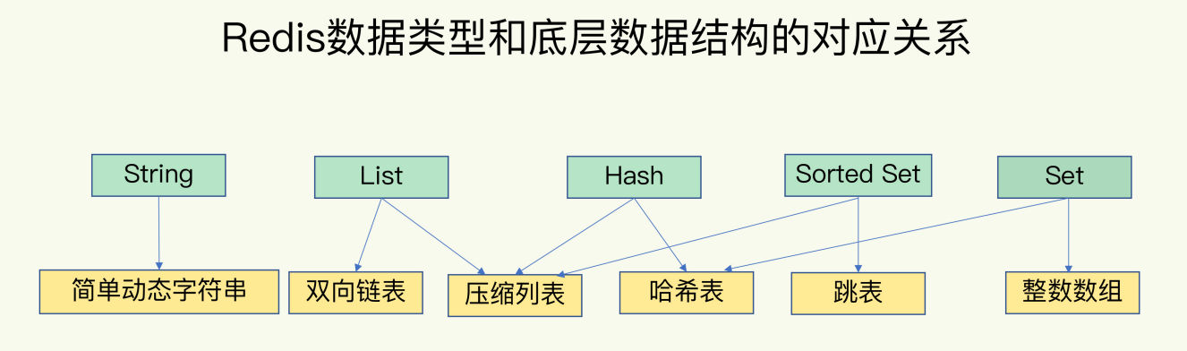 简单来说,底层数据结构一共有 6 种,分别是简单动态字符串、双向链表、压缩列表、哈希表、跳表和整数数组。它们和数据类型的对应关系如下图所示: