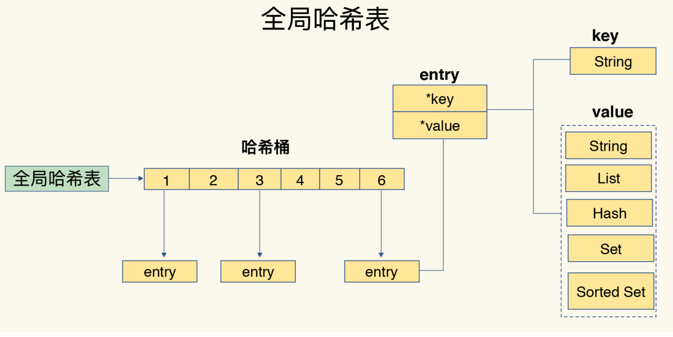 一个哈希表,其实就是一个数组,数组的每个元素称为一个哈希桶。所以,一个哈希表是由多个哈希桶组成的,每个哈希桶中保存了键值对数据。其实,哈希桶中的元素保存的并不是值本身,而是指向具体值的指针。这也就是说,不管值是 String,还是集合类型,哈希桶中的元素都是指向它们的指针。如下所示: