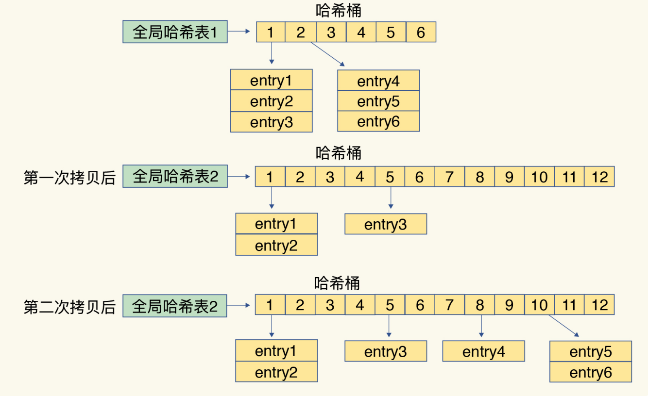 简单来说就是在第二步拷贝数据时,Redis 仍然正常处理客户端请求,每处理一个请求时,从哈希表 1 中的第一个索引位置开始,顺带着将这个索引位置上的所有 entries 拷贝到哈希表 2 中;等处理下一个请求时,再顺带拷贝哈希表 1 中的下一个索引位置的entries。如下图所示:
