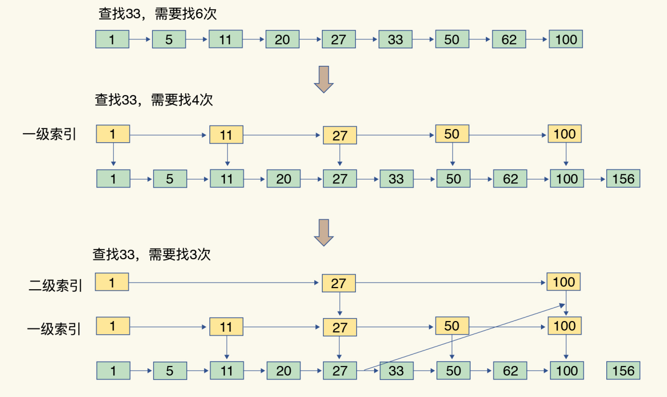 跳表在链表的基础上,增加了多级索引,通过索引位置的几个跳转,实现数据的快速定位,如下所示: