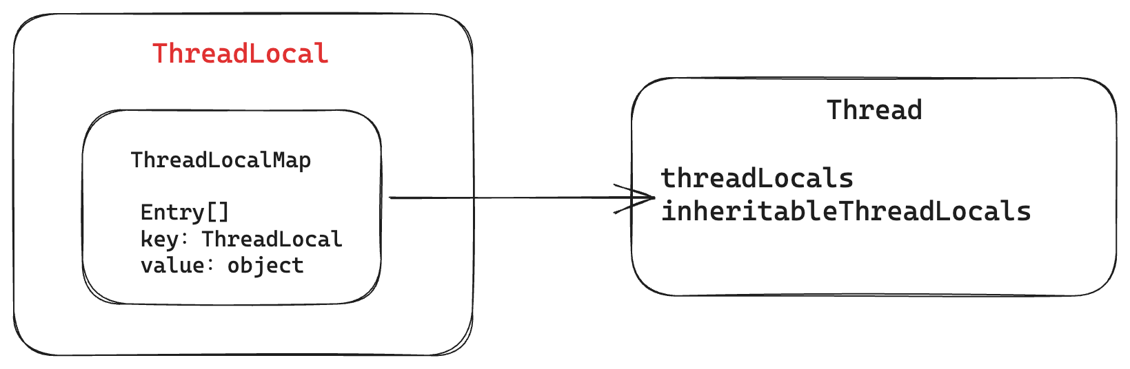 Thread 类中有threadLocals、inheritableThreadLocals两个变量,负责存储当前线程的缓存对象。 变量可以保存多个对象,通过数组对象进行存储,其中对象的 key 为ThreadLocal,value 为 object 对象。