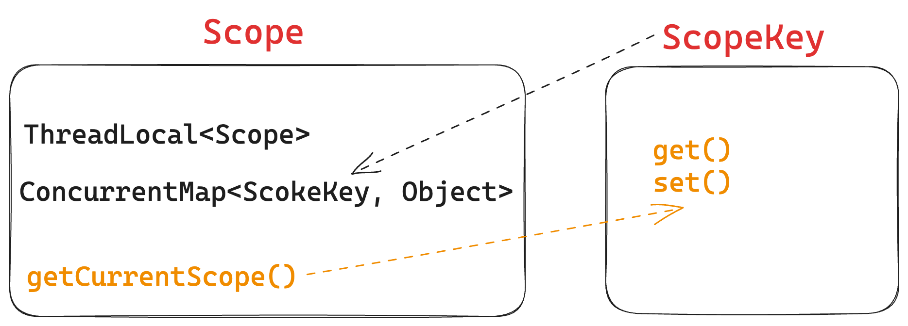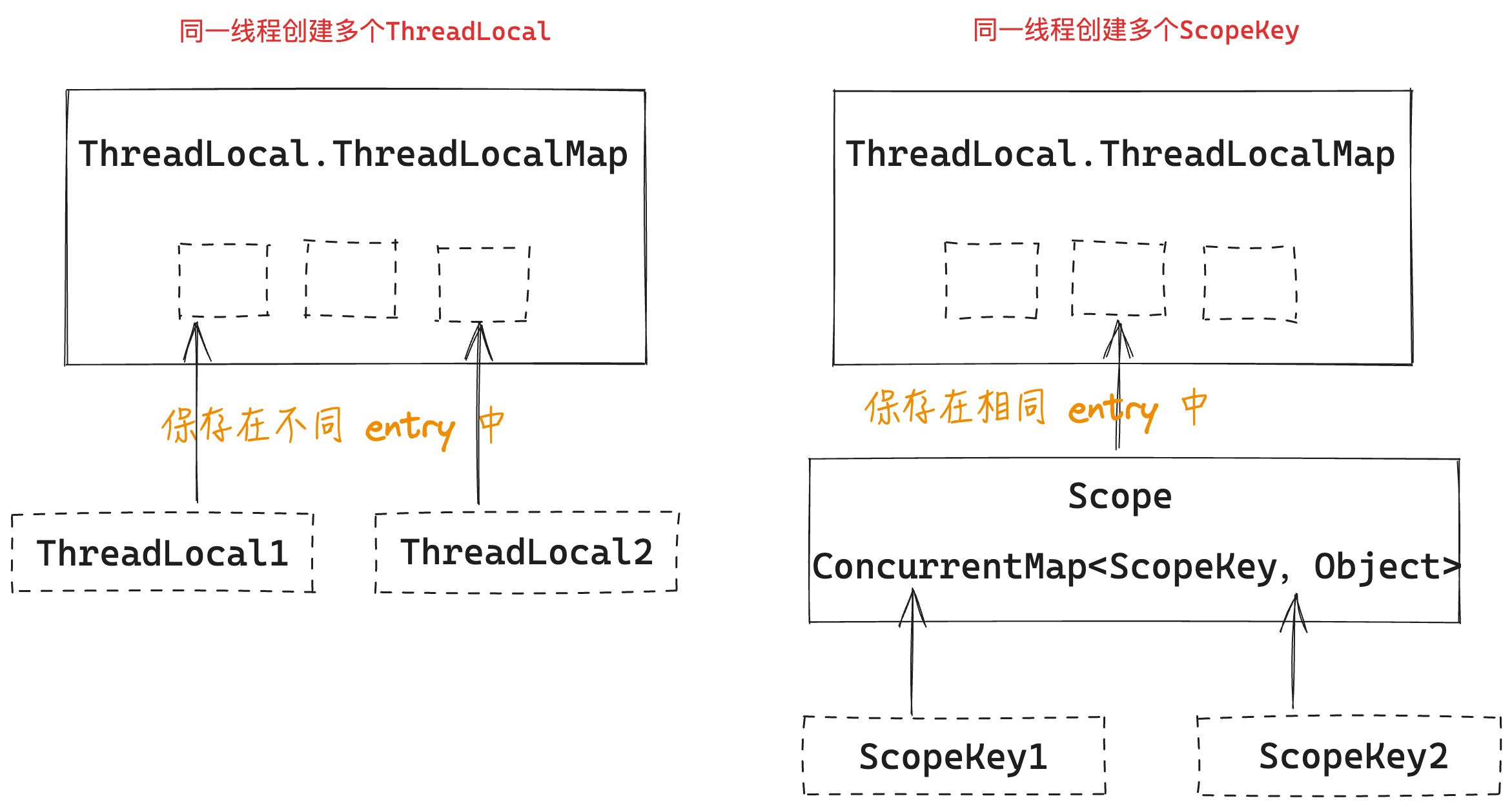 - 不同的 ScopeKey 保存在相同的 Scope 容器内,一个线程只会有一个 Scope 容器,该 Scope 容器保存在 ThreadLocal 中,也就是说所有的 ScopeKey 保存在同一个entry 数组中
