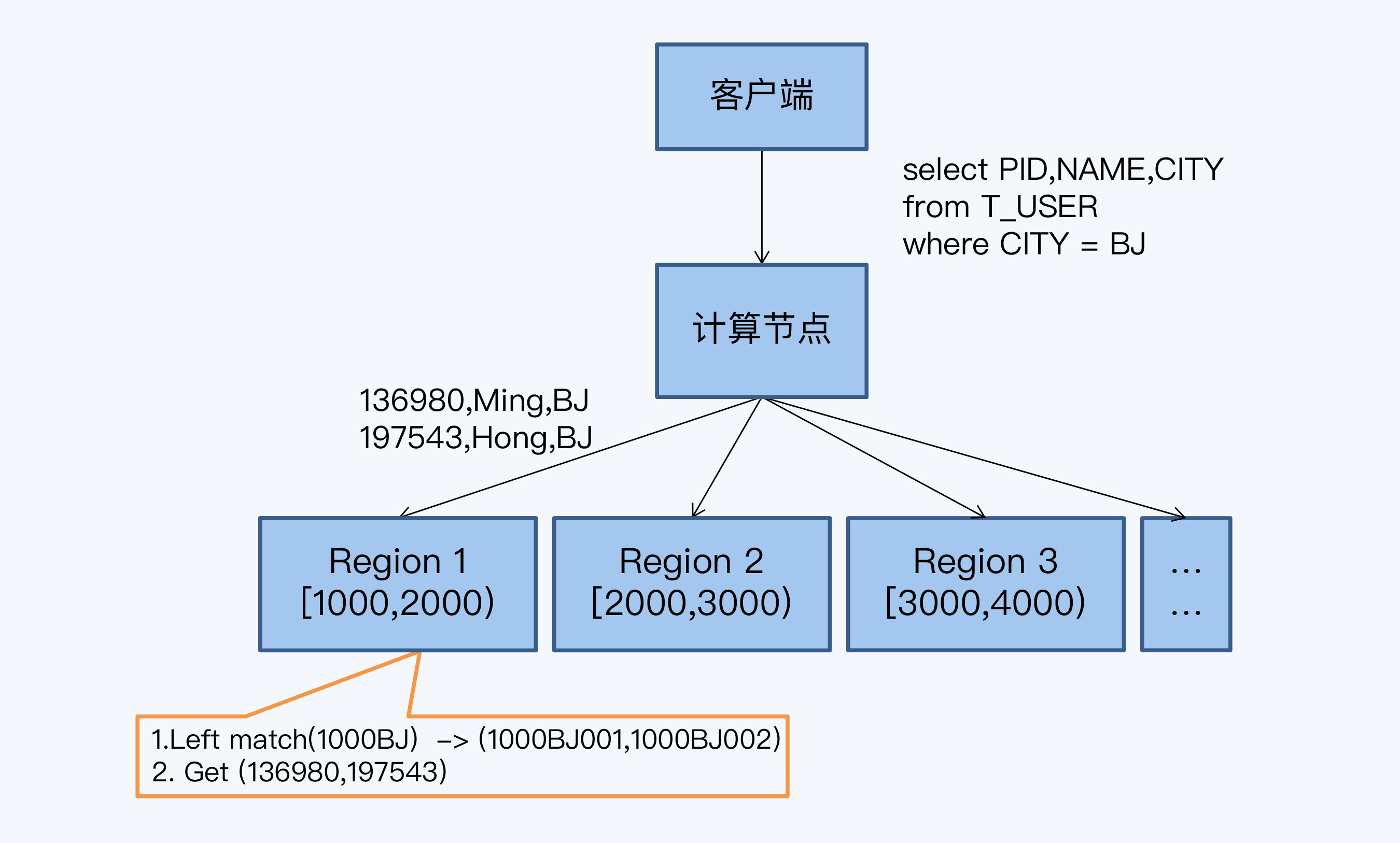 分布式数据库可以提供海量并发、海量存储的关键能力在于分片(Regin),分片根据特定规则将切分好的数据记录分布到多个节点上,从而实现更强的存储和计算能力。