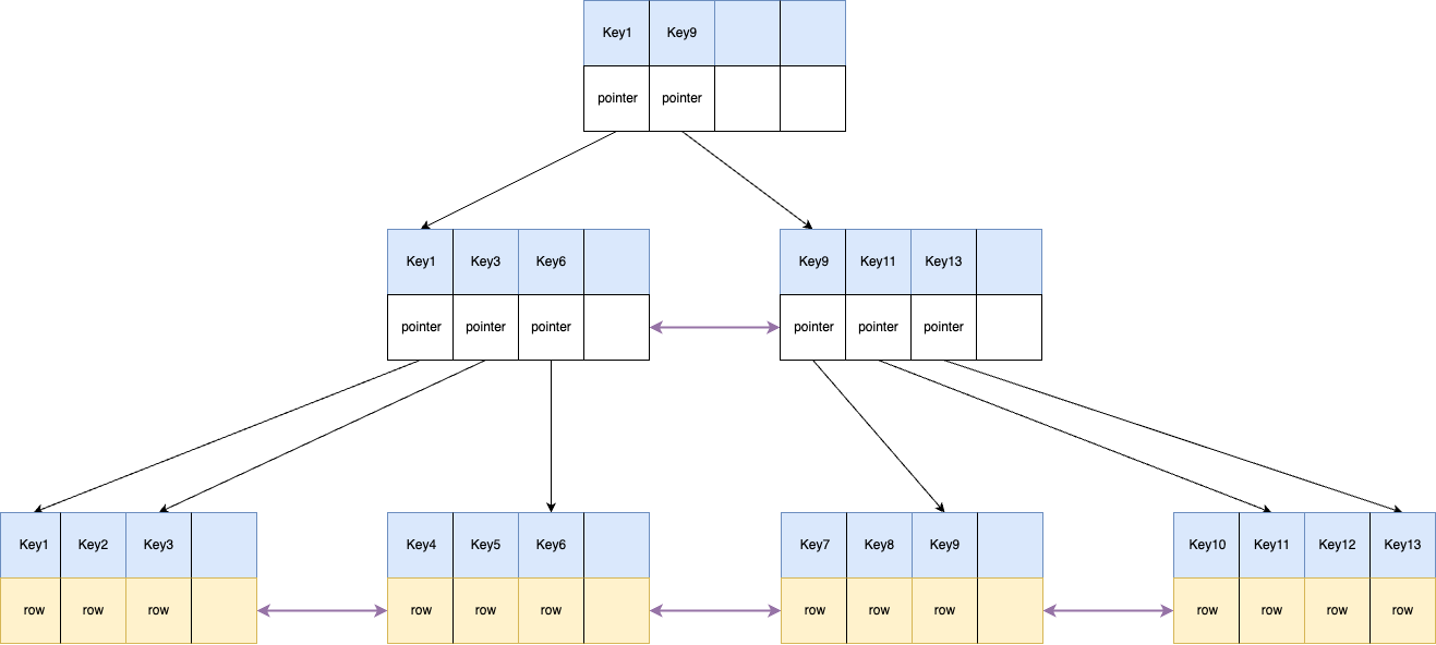 - 由于内部节点不保存具体数据,因此相同大小可以保存更多索引,这样可以查找时可以更少的磁盘 IO。