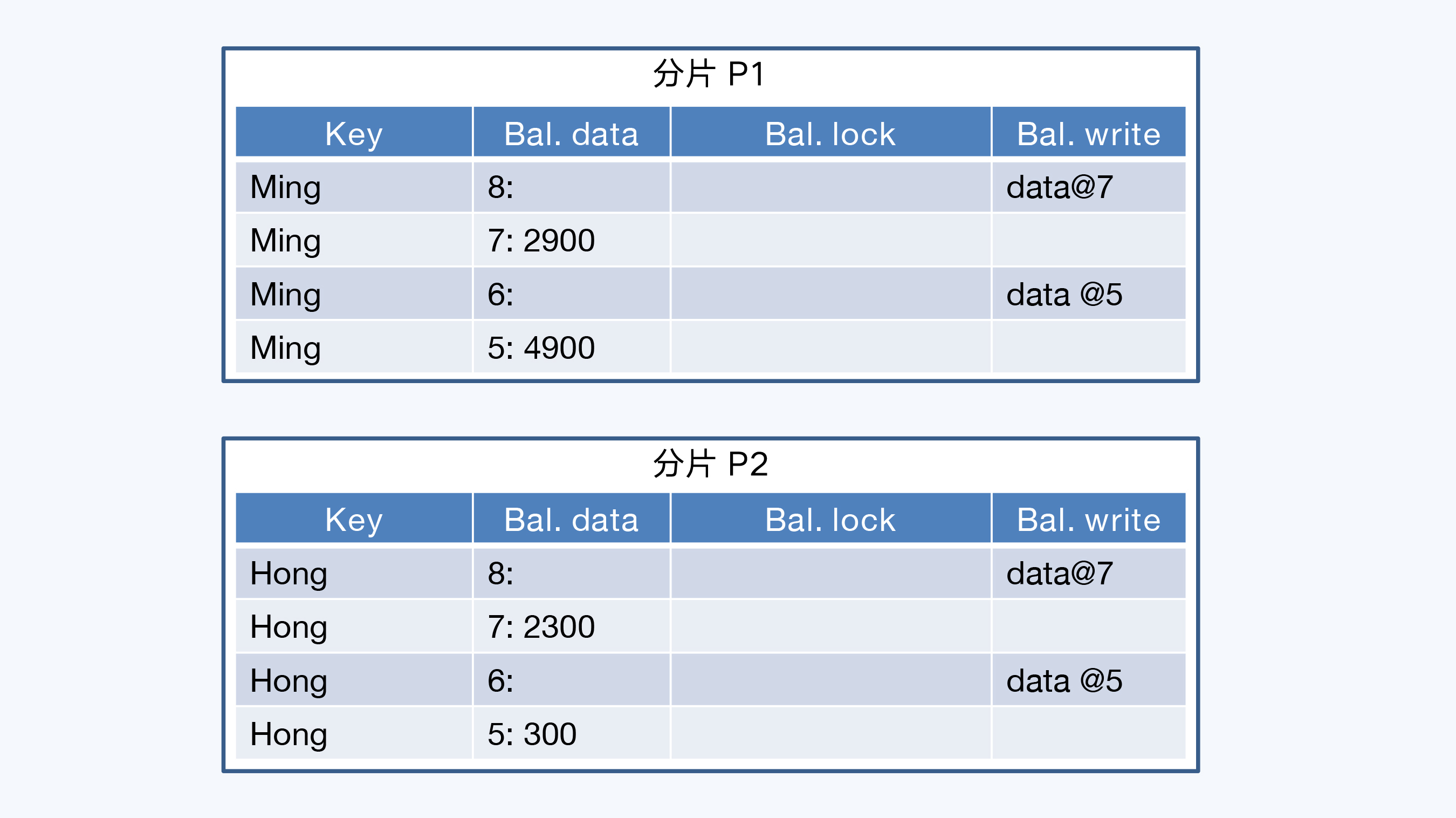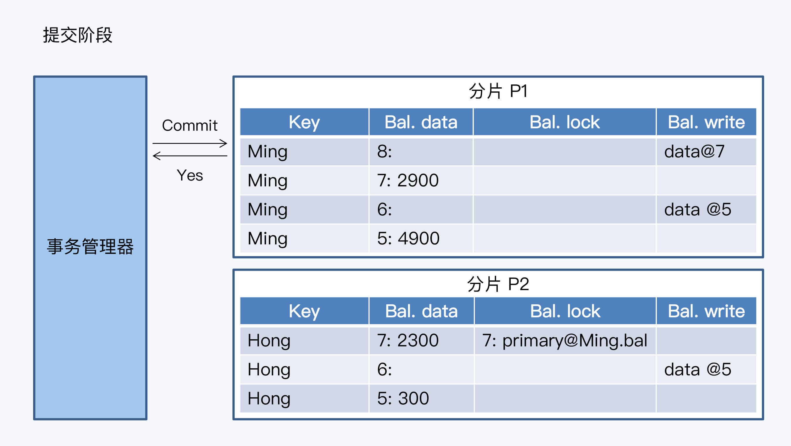 准备阶段结束的时候,两个分片都增加了私有版本记录,余额正好是转账顺利执行后的数字。