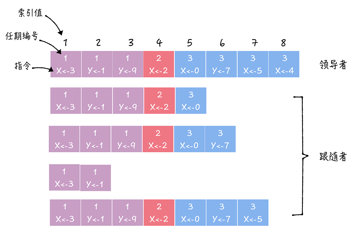 与此同时 Raft 协议强制以领导者节点的日志为准,当发现领导者和跟随者日志不同时会依次向前寻找,直到找到最先出现不同的索引,然后以领导者日志为准进行覆盖更新。