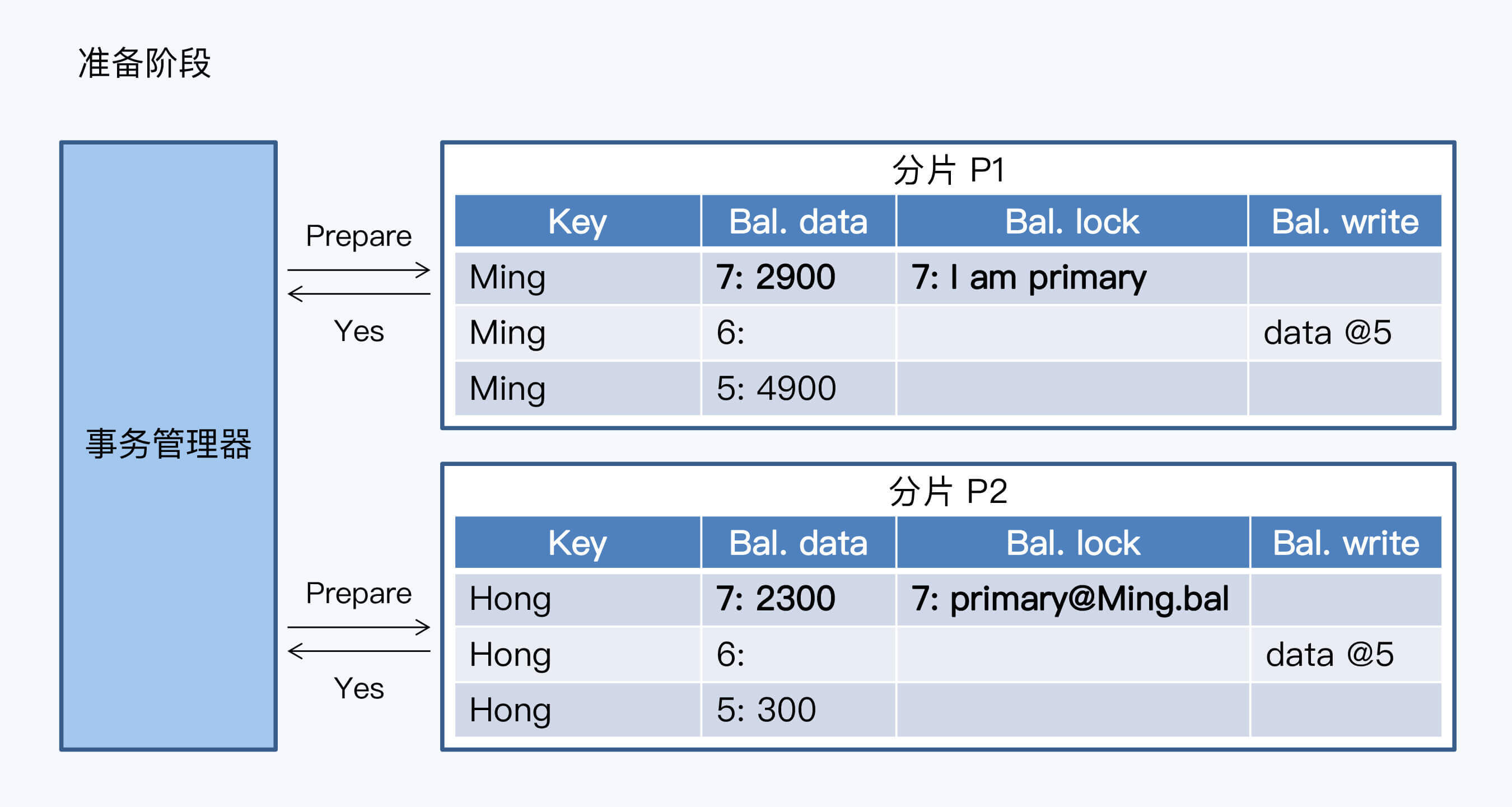 准备阶段时事务管理器会给每个分片发送对应数据执行请求,每个分片收到请求后写入一个新记录,新纪录会被加上锁,只有当前事务才能读取到锁内容,所有分片的行锁只有一个主锁,主锁会随机分配到某个分片上,其余的锁指向主锁记录。与此同时还会写下本次操作日志。