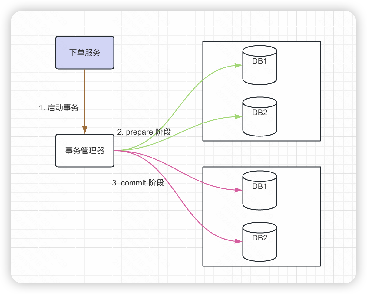 又被称为两阶段提交,两个阶段分别是 prepare 和 commit,具有事务管理器、资源管理器两个角色。两阶段提交依赖底层数据库的事务能力,底层的单体数据库也被称为资源管理器。