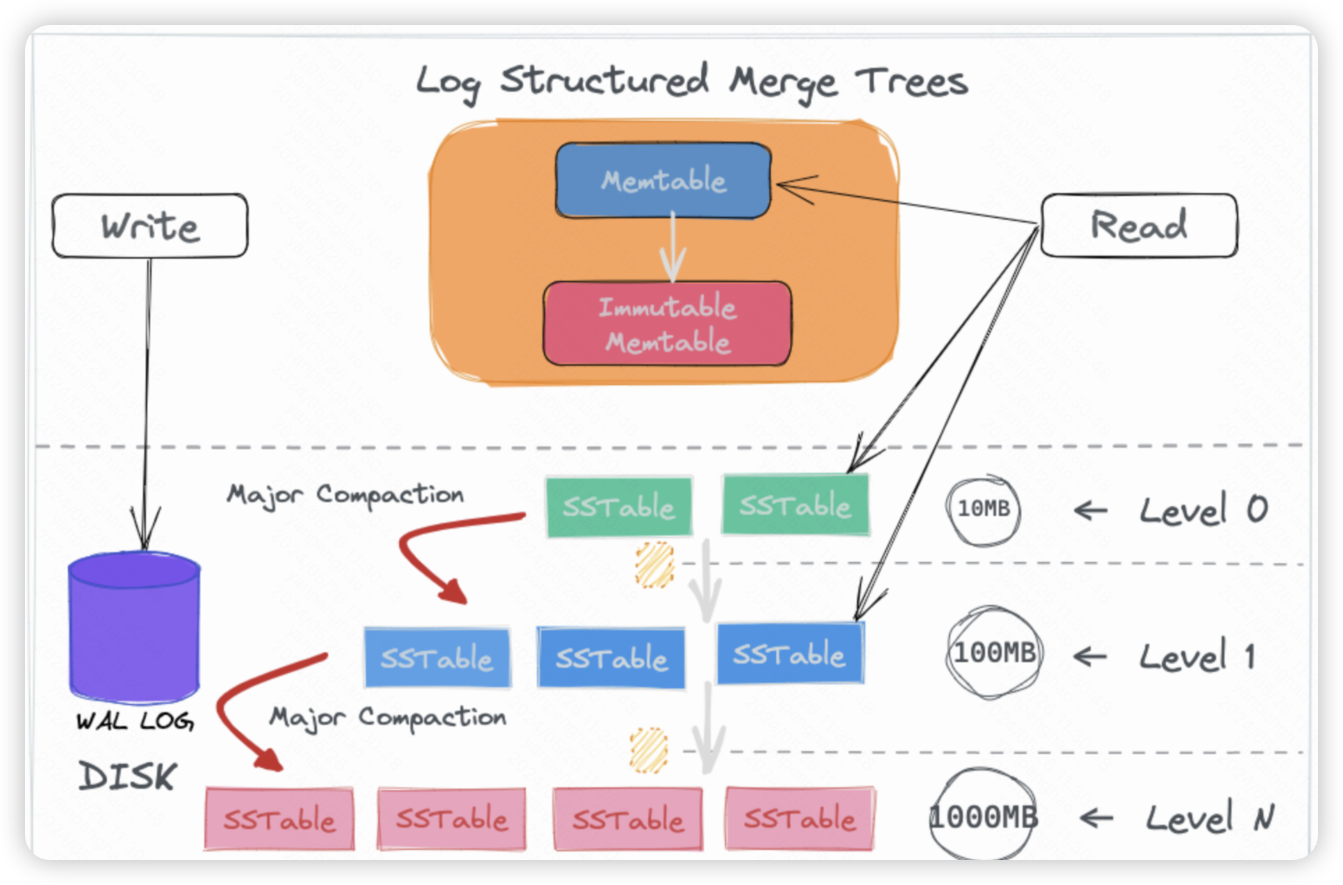 MemTable往往是一个跳表(Skip List)组织的有序数据结构。对比B+树,当数据量特别大时,由于B+树更新和删除数据时需要沿着B+树逐层进行页分裂和页合并,严重影响数据写入性能。