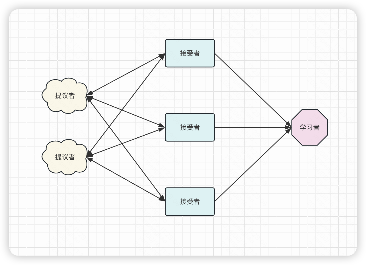 - 接受者:参与共识协商,对每个提议进行投票表决,并存储提议的值。