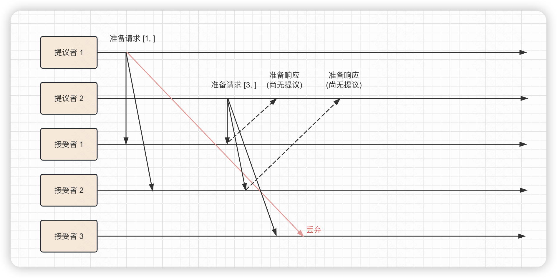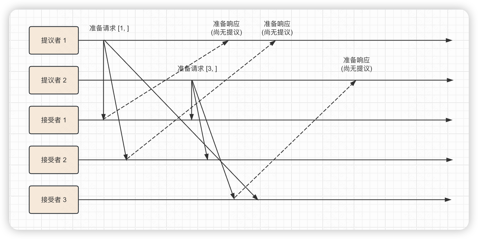 准备阶段提议者发出请求并带上自身提议号 ,各节点第一次收到请求时都会返回响应并记下当前提议号,并承诺不会接受比该提议号更小的提议