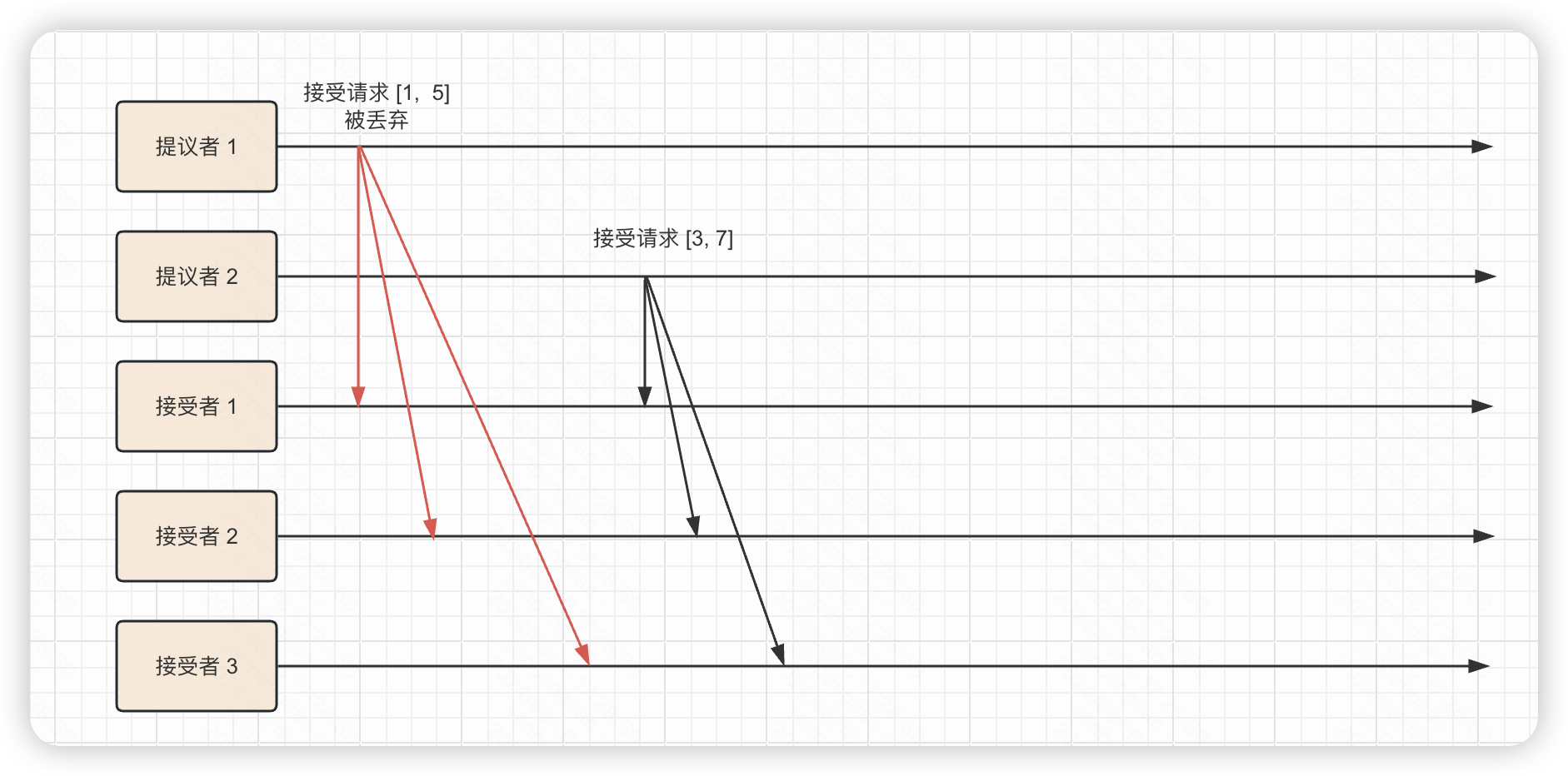 此时三个接受者的最大提议号都是 3,准备阶段结束,进入接受阶段。