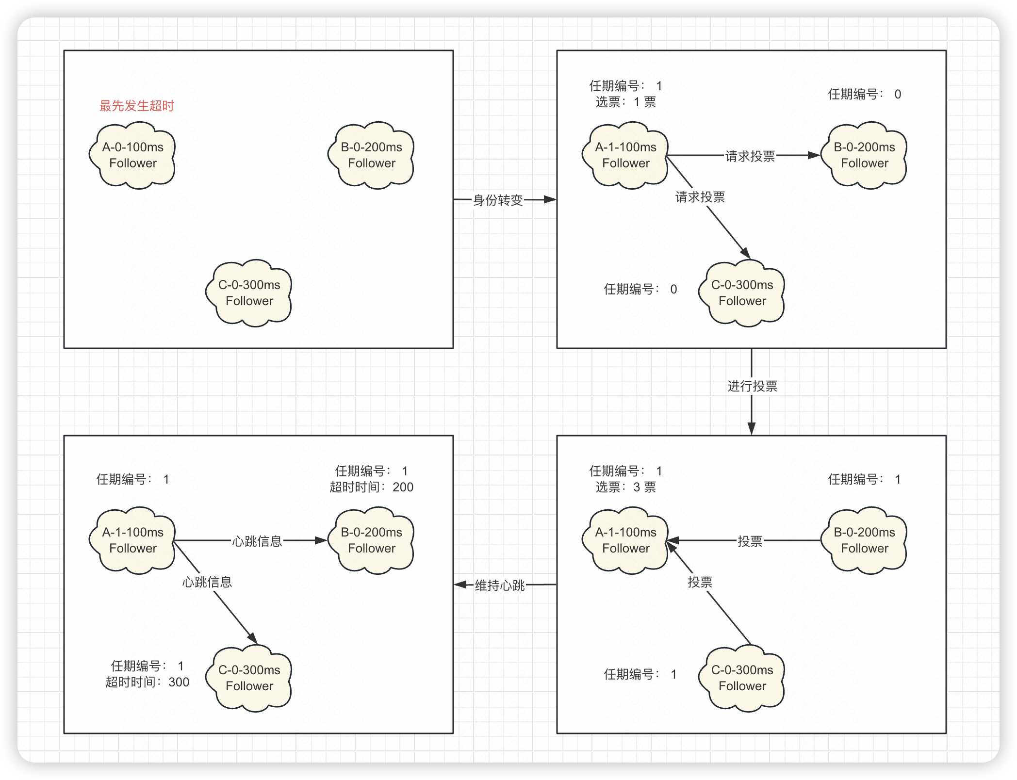 - 集群内的节点在初始阶段是没有 leader 的,此时所有节点都处于 follower 身份,Raft 算法实现了随机超时时间的特性。也就是说,每个节点等待领导者节点心跳信息的超时时间间隔是随机的。等待超时时间最小的会因为没有等到领导者的心跳信息,发生超时,此时节点会转化为Candidate身份。
