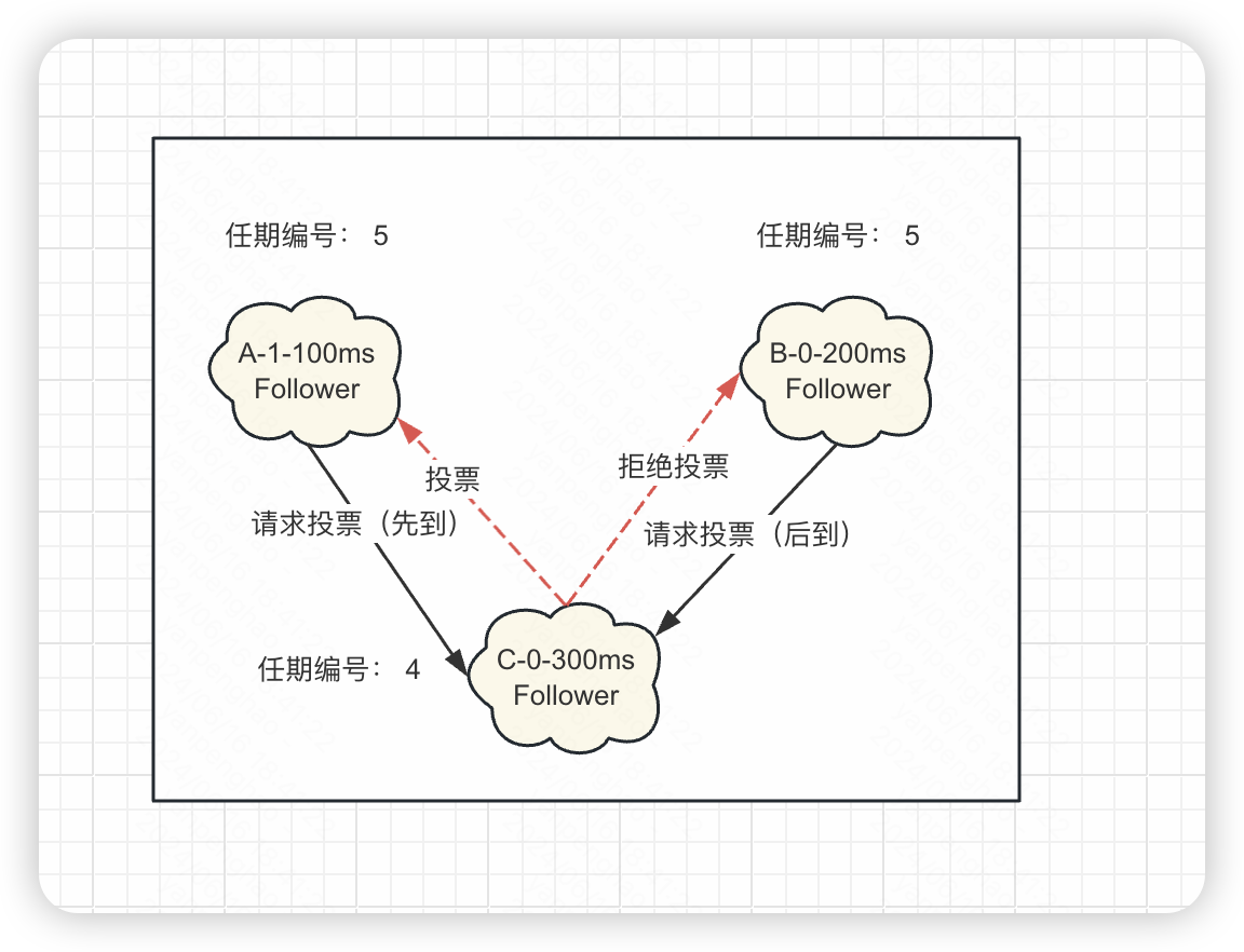 - 如果一个节点接收到一个包含较小的任期编号值的请求,那么它会直接拒绝这个请求。