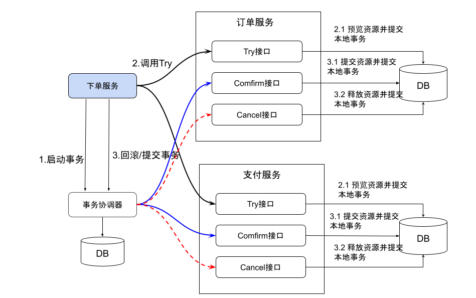 - 需要业务系统自行实现 Try,Confirm,Cancel 三个操作,对业务系统有着非常大的入侵性,设计相对复杂。